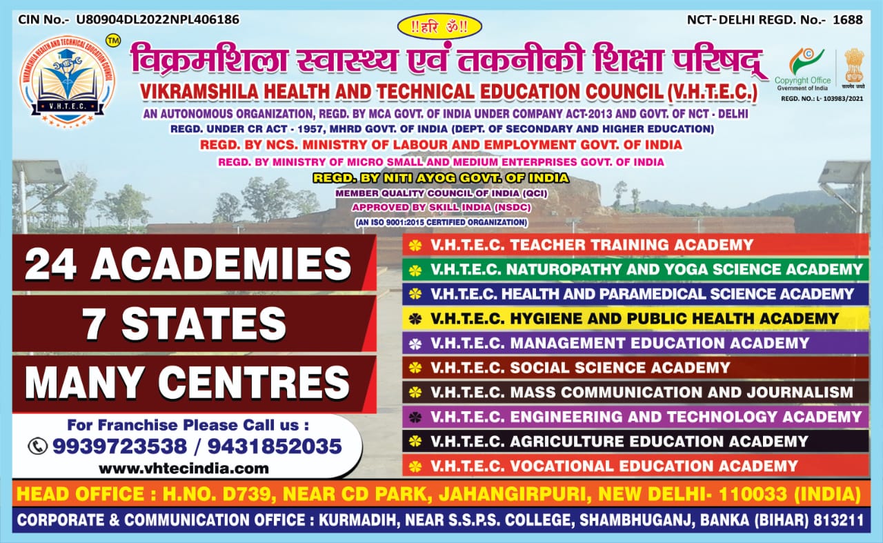VIKRAMSHILA HEALTH AND TECHNICAL EDUCATION COUNCIL (V.H.T.E.C.) is an autonomous council. That aims to create scholars who are most distinguished among all. The main source of inspiration behind this huge project lies in the ancient VIKRAMSHILA UNVERSITY, which was a center of excellence established by the eminent Pala Emperor, DHARMAPALA in the 8th century CE. DR. MITHILESH PRASAD SINGH, the founder of this council aims to build such a kind of University where students can enhance their skills and experience by taking the best training sessions, to fulfill the mission and vision of his Father LATE SHRI ADHYA PRASAD SINGH & Mother SMT. PREMLATA DEVI.